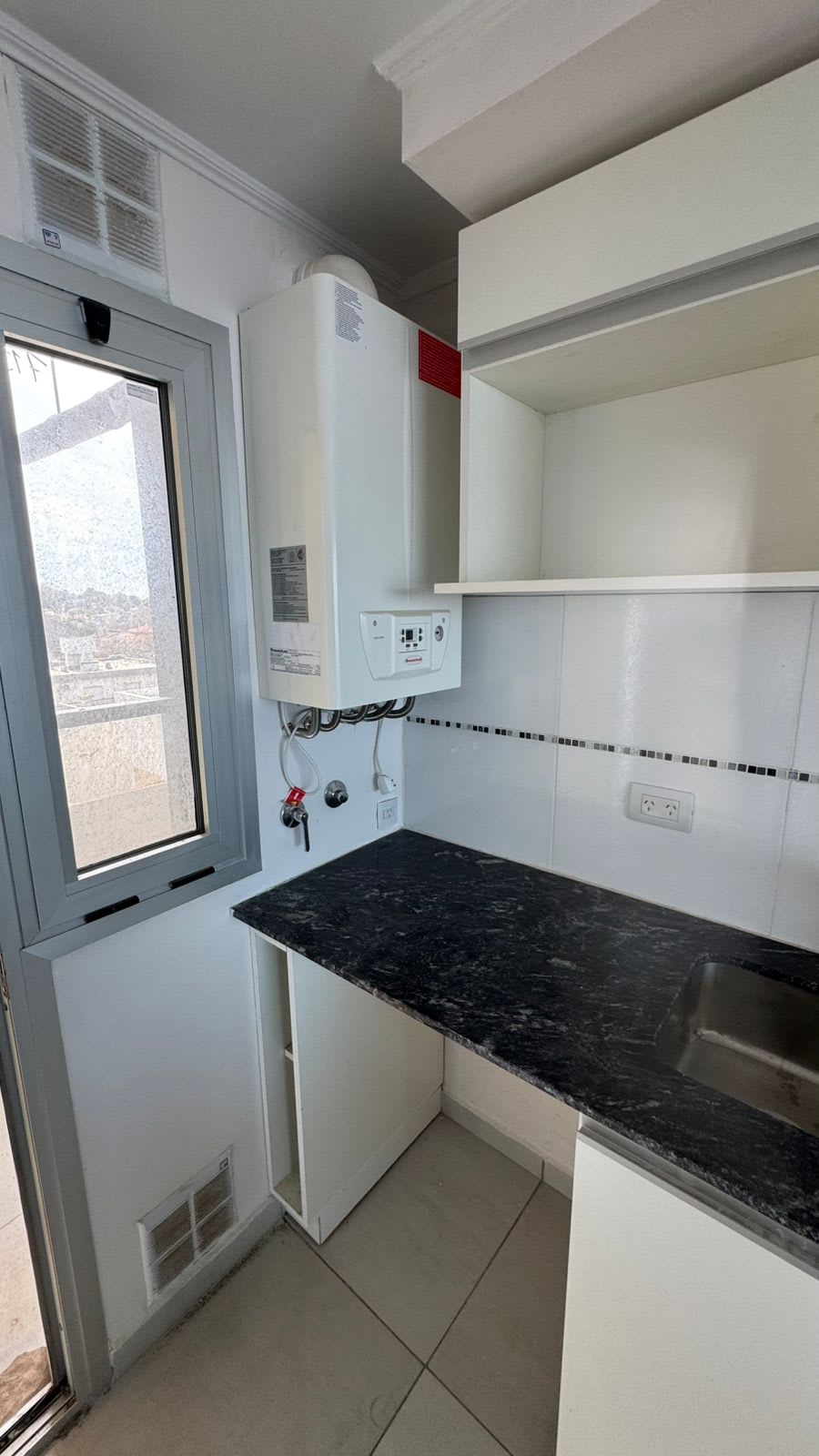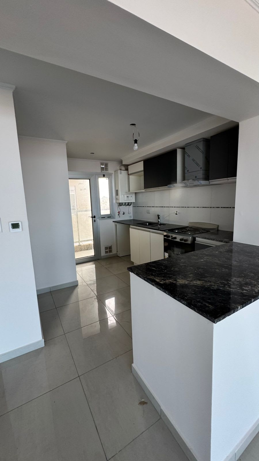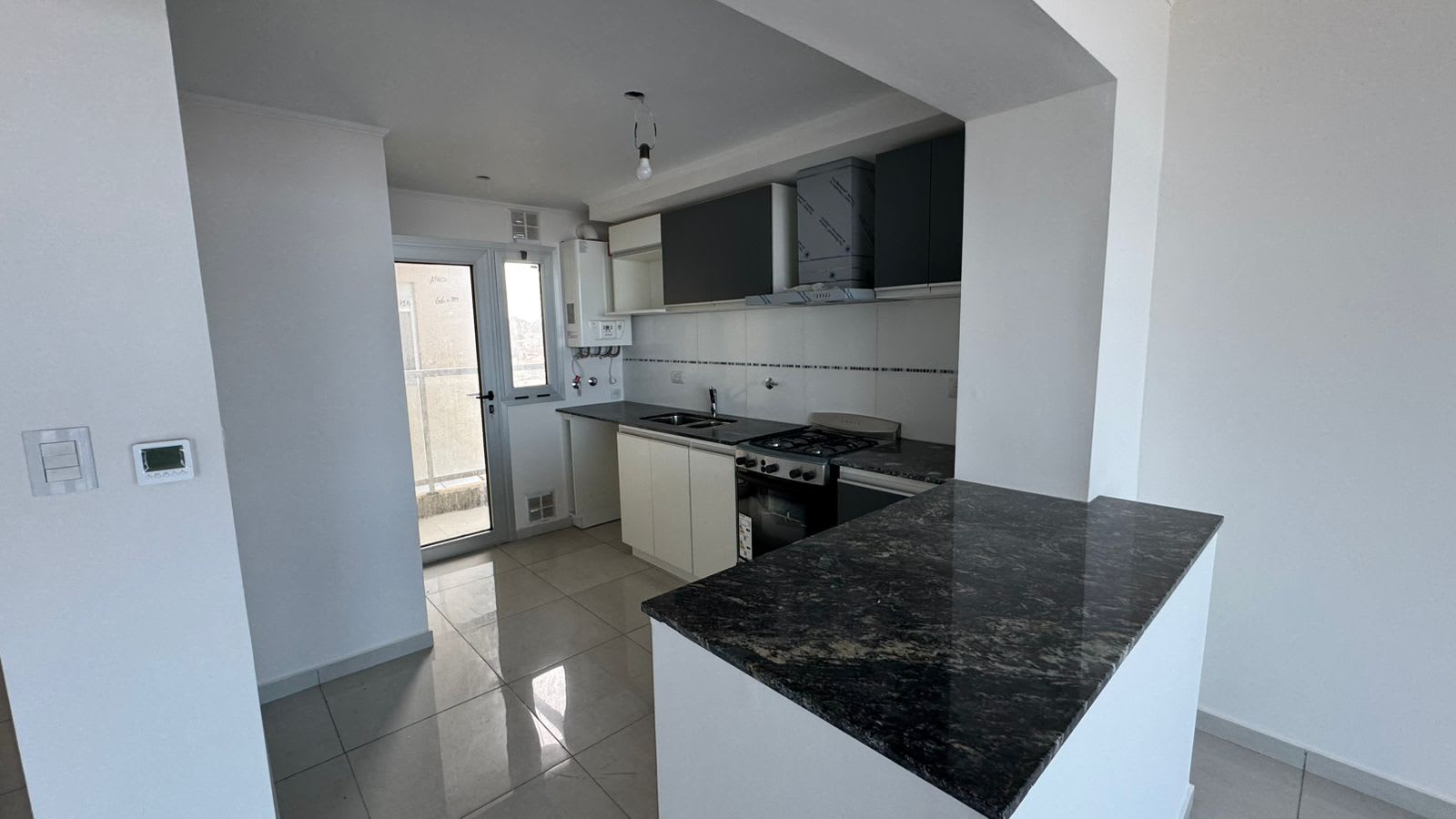 Cocina separada por barra desayunadora, muebles completos (alacenas y bajo mesadas), espacio para lavarropas y acceso a BALCÓN de SERVICIO (p/tender).